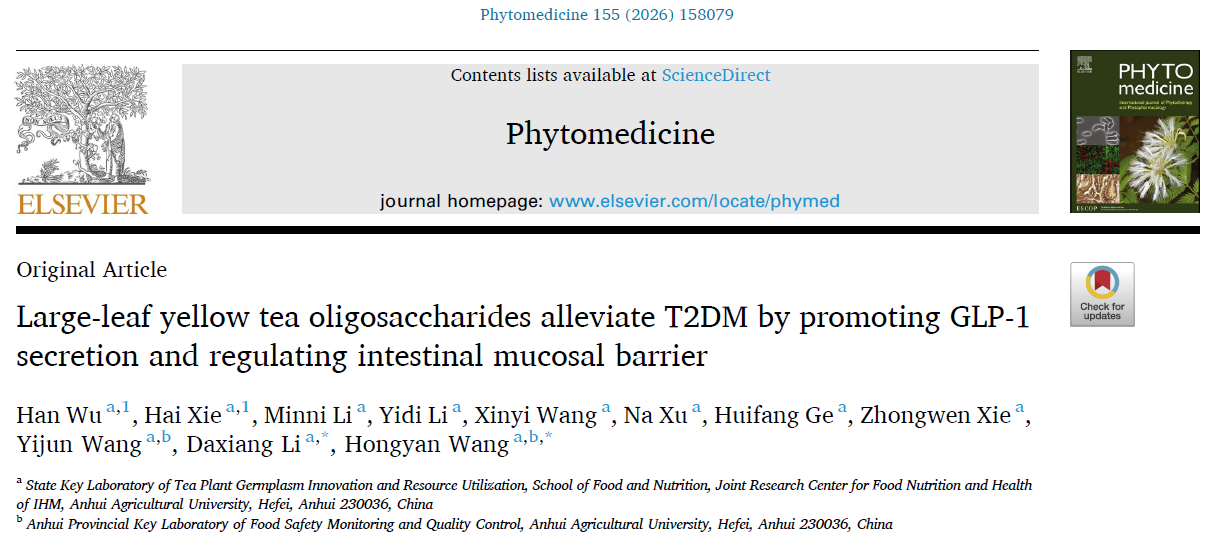 本网讯 近日,国际知名期刊《Phytomedicine》(T2,IF=8.3)在线发表了304永利王红燕老师题为“Large-leaf yellow tea oligosaccharides alleviate T2DM by promoting GLP-1 secretion and regulating intestinal mucosal barrier”的研究论文。该研究聚焦黄大茶特征活性成分的降糖功效与作用机制这一核心科学问题,从黄大茶多糖中分离鉴定出具有显著促GLP-1分泌活性的寡糖组分,系统揭示了其通过促进GLP-1分泌、维持肠道稳态降低血糖的分子机制,...