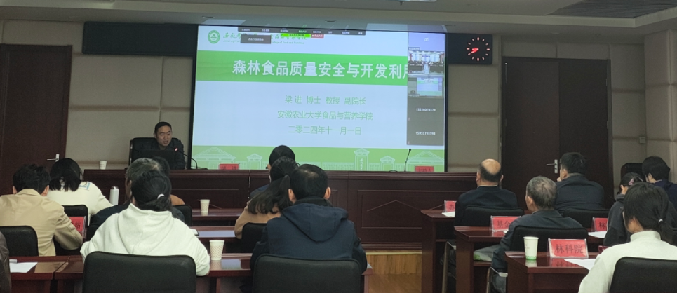 本网讯 2024年11月1日上午,安徽省林业局在省林业综合楼举办全省食用林产品质量安全监管工作培训班,会议由国际合作与林产业处副处长余波主持,采用线上和线下相结合方式进行。304永利副经理梁进教授应邀做了题为“森林食品质量安全与开发利用”的培训讲座,重点讲解了森林食品类型及产业现状、森林食品质量安全及管理、安徽林特食品开发与利用等方面内容,授课内容丰富,针对性强。