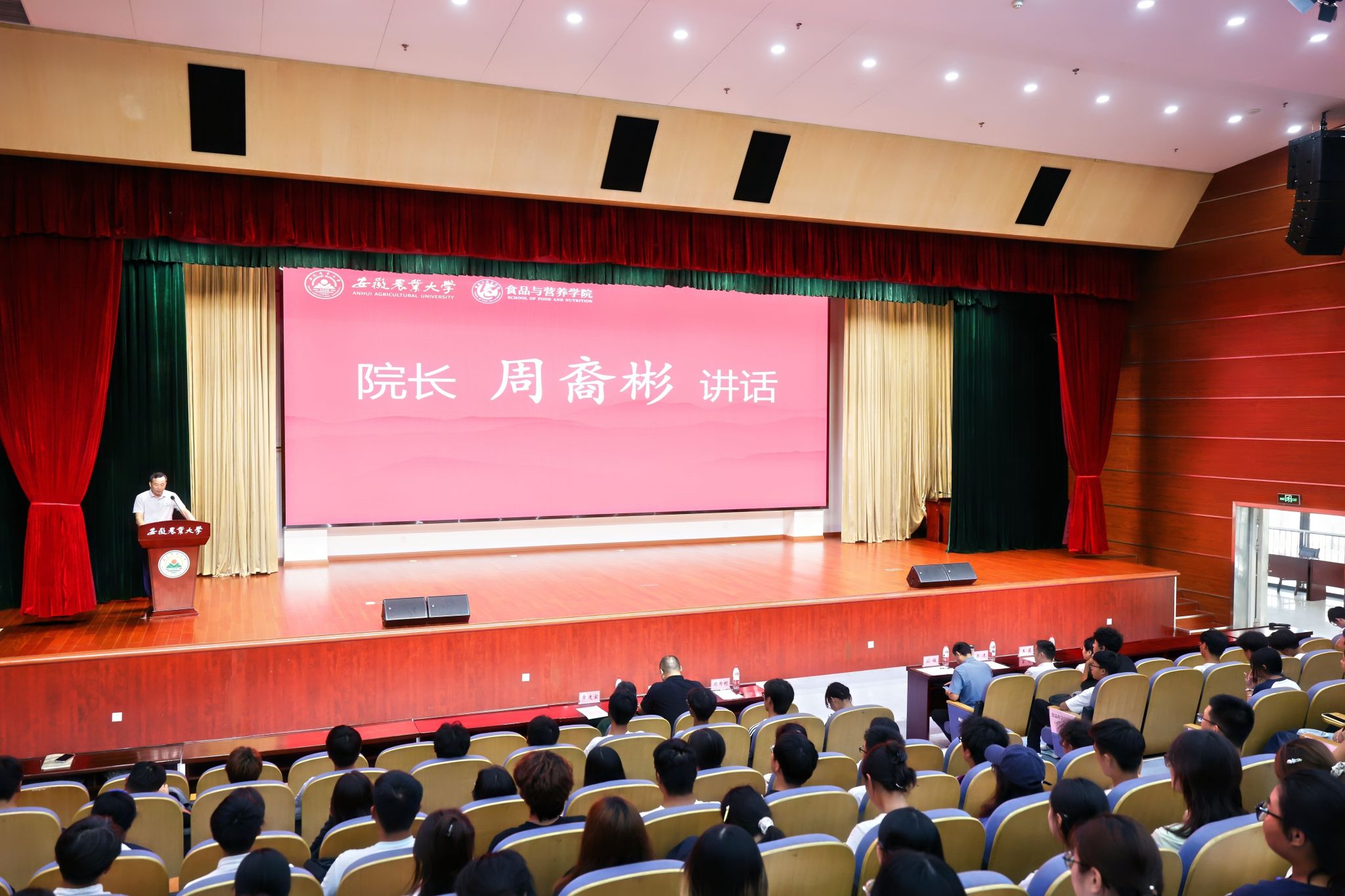 会议在雄壮的国歌声中开始。经理周裔彬首先代表全院师生向2025级新同学表示热烈欢迎和祝贺。他从学院发展历程、专业设置、团队队伍、团队建设、办学成绩等方面给大家做了介绍,强调了食品学科在保障食品安全、创新营养健康产品中的关键作用,勉励新生以兴趣为帆、以责任为桨,在专业领域中探索无限可能。
