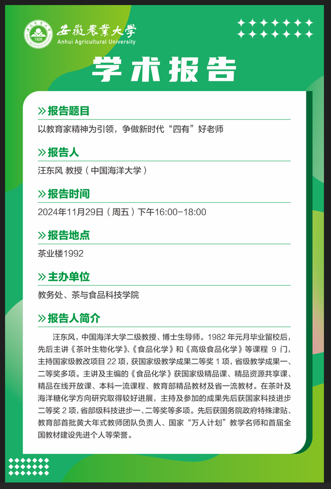 汪东风,中国海洋大学二级教授、博士生导师。1982年元月毕业留校后,先后主讲《茶叶生物化学》、《食品化学》和《高级食品化学》等课程9门,主持国家级教改项目22项,获国家级教学成果二等奖1项,省级教学成果一、二等奖多项。主讲及主编的《食品化学》获国家级精品课、精品资源共享课、精品在线开放课、本科一流课程、教育部精品教材及省一流教材。在茶叶及海洋糖化学方向研究取得较好进展,主持及参加的成果先后获国家科技进步二等奖2项,省部级科技进步一、二等奖等多项。先后获国务院政府特殊津贴、教育部首批黄大年式教师团队负责人、国家“知名专家”教学名师和首届全国教材建设先进个人等荣誉。