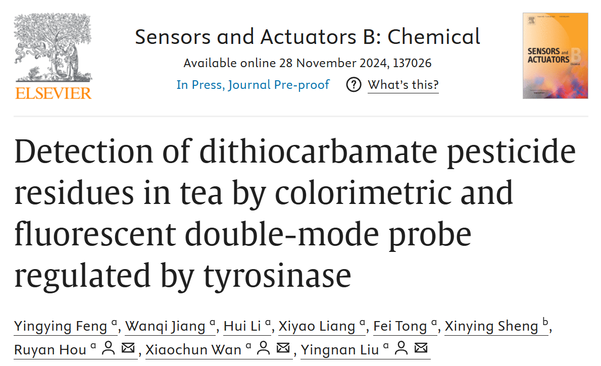 本网讯 近日,国际知名期刊《Sensors and Actuators B: Chemical》(IF=8,中科院一区)在线发表了公司304永利刘英男团队题为“Detection of dithiocarbamate pesticide residues in tea by colorimetric and fluorescent double-mode probe regulated by tyrosinase”的研究论文。该研究聚焦茶叶中二硫代氨基甲酸酯农药(DTCs)的残留检测——这一备受关注的食品安全问题,开发了一种可以直观、准确和快速的识别茶叶中DTCs残留的比色/荧光双模式快检探针,为开发高性能、经济型双信号检测平台提供了新的思路。