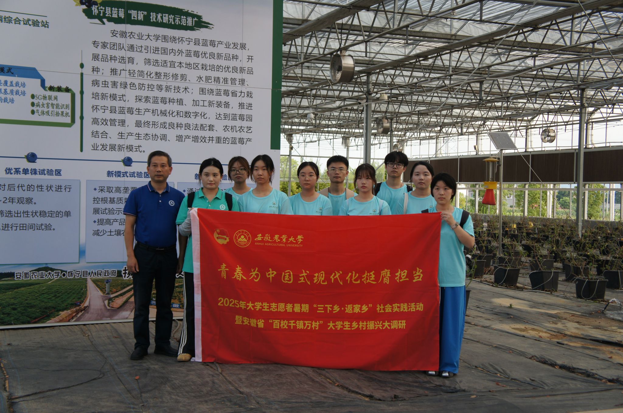 在试验站朱正国老师的带领下,队员们参观了核心实验室与蓝莓种植示范基地。据朱正国老师介绍,怀宁蓝莓产业作为五大产业联盟的核心,已成为“蓝色引擎”,试验站通过突破技术瓶颈、转化科研成果,助力其从“规模种植”向“品质领跑”迈进。随队老师夏业鲍向团队讲解了实验室的各种仪器及其用途。实验室的精密设备与组培室的幼苗,以及大棚中传感器实时监测的科技种植模式,凸显了科研与产业的紧密联结。